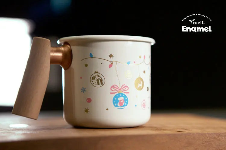 Truvii emaille mok met houten handvat - kerst limited edition - campingbeker - kampeermok